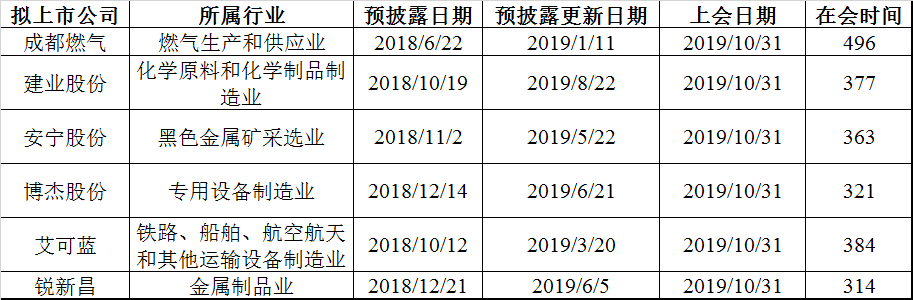 第十八届发审委2019年第160、161次会议将于2019年10月31日召开,上会的企业包括成都燃气集团股份有限公司、浙江建业化工股份有限公司、四川安宁铁钛股份有限公司、珠海博杰电子股份有限公司、安徽艾可蓝环保股份有限公司和天津锐新昌科技股份有限公司,各家基本情况如下,其中该篇文章主要对前三家公司情况进行介绍,后三家情况在后续文章内会做出分析: