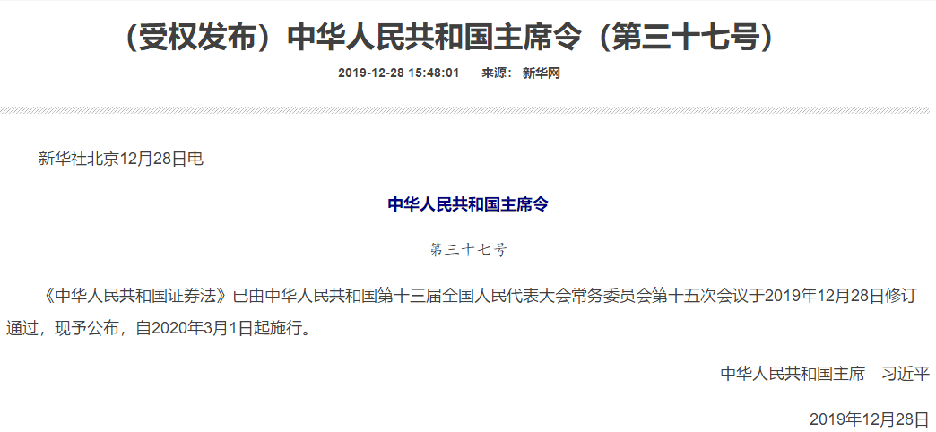 原标题:明年3月起,你熟知的证券市场有变化!10位专家详细解读证券法5大修订要点! 来源:上海证券报微信公众号 “升级版”证券法来了!今天上午,十三届全国人大常委会第十五次会议审议通过了《中华人民共和国证券法》(下称“证券法”)修订草案,经修订的证券法将自2020年3月1日起正式实施。