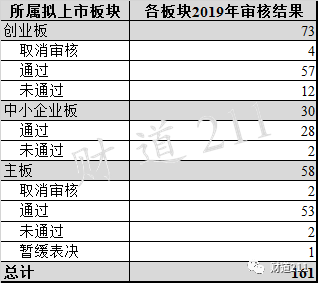 2019年上会的161家企业中,主板58家,53家通过审核,2家取消审核,1家暂缓表决,2家被否;中小板30家,28家通过审核,2家被否;创业板73家,57家通过审核,4家取消审核,12家被否。