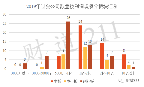 由以上两图对比可知,分上市板块来看,大多数申报主板的拟上市公司的利润都在1亿元以上,而中小板和创业板申报的拟上市公司的利润主要在5000万-1亿以及1亿-2亿元的区间。中小板和创业板利润在1亿元以上的拟上市公司在2019年无未成功过会的案例。创业板利润规模在5000万-1亿元的申报企业未能成功过会案例最多。