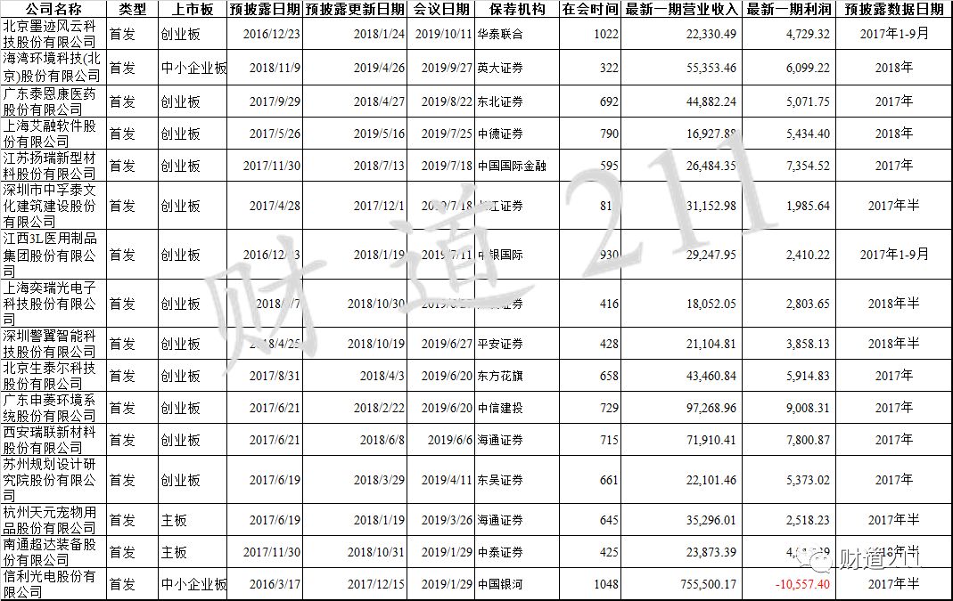 6、过会企业排队时间最长的是中信证券保荐的瑞达期货股份有限公司,该企业2015年4月24日即预披露招股书,2016年12月5日预披露更新招股书,直至2019年7月11日才被安排上会,在会时间1539天。坚持的最久,利润还能保持住,不愧是金融业的企业。
